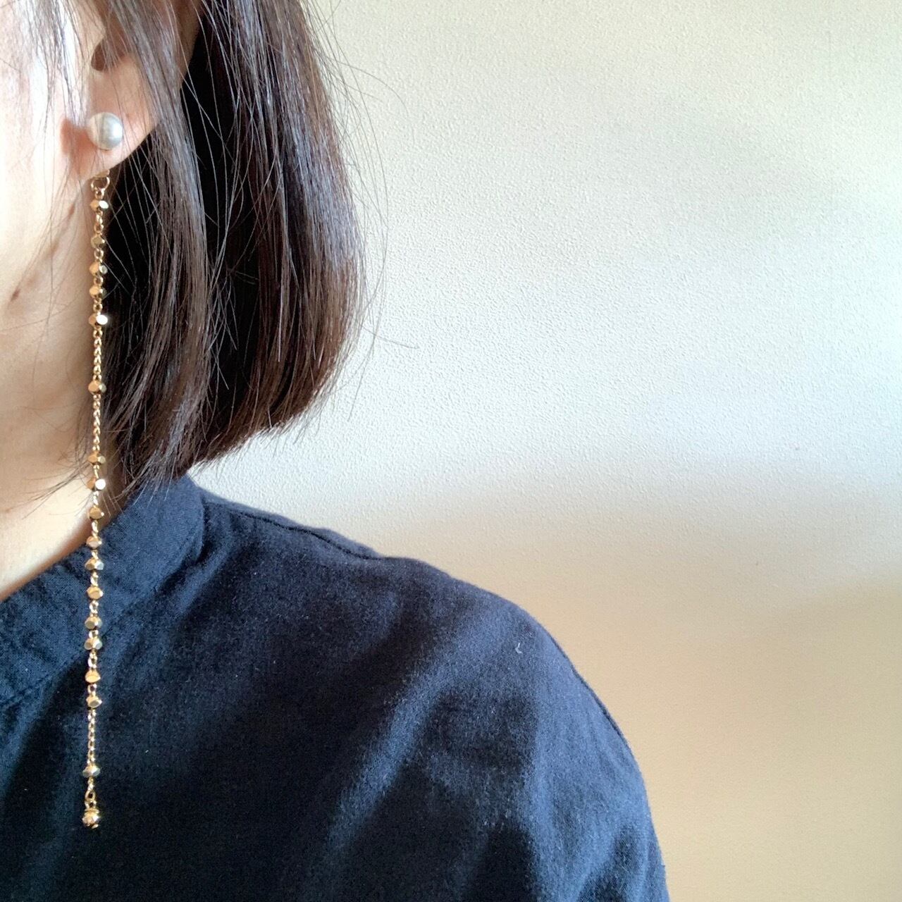 長いチェーンのつぶつぶビーズの位置もランダムに配置し、シンプルながらもこだわりのあるデザインに仕上げています。
