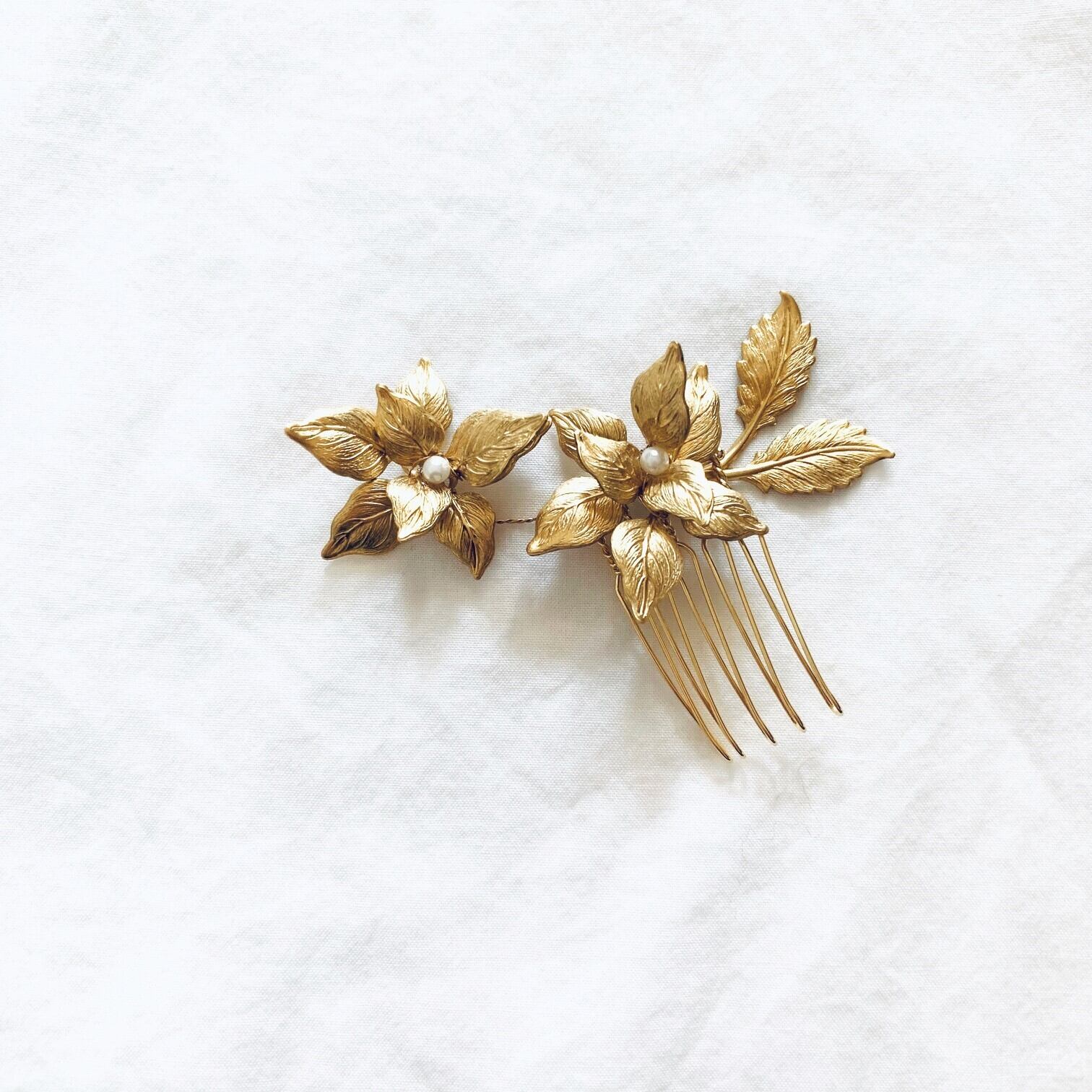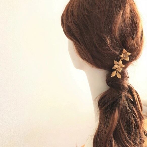 小さなリーフを立体的に重ね、お花のようなデザインに仕上げたヘアコーム。
