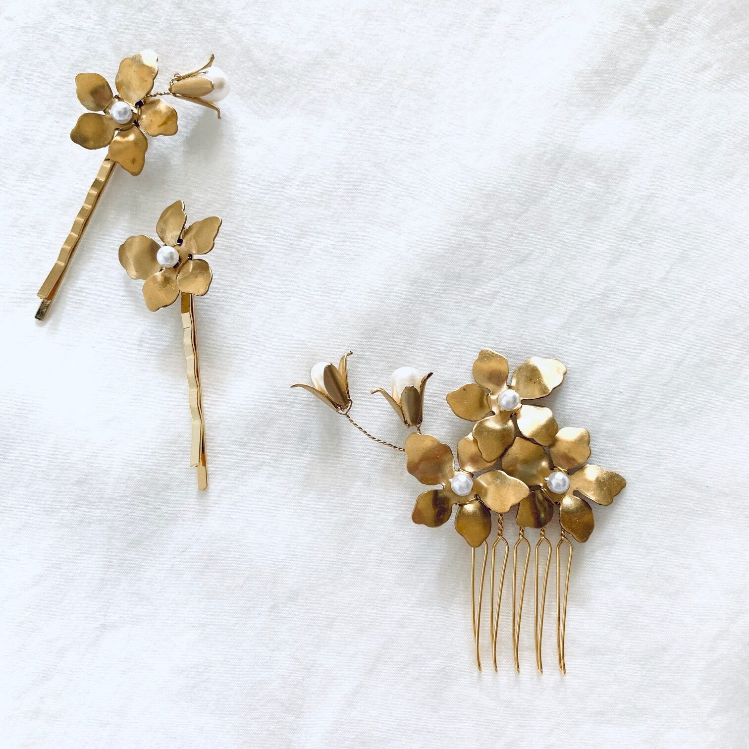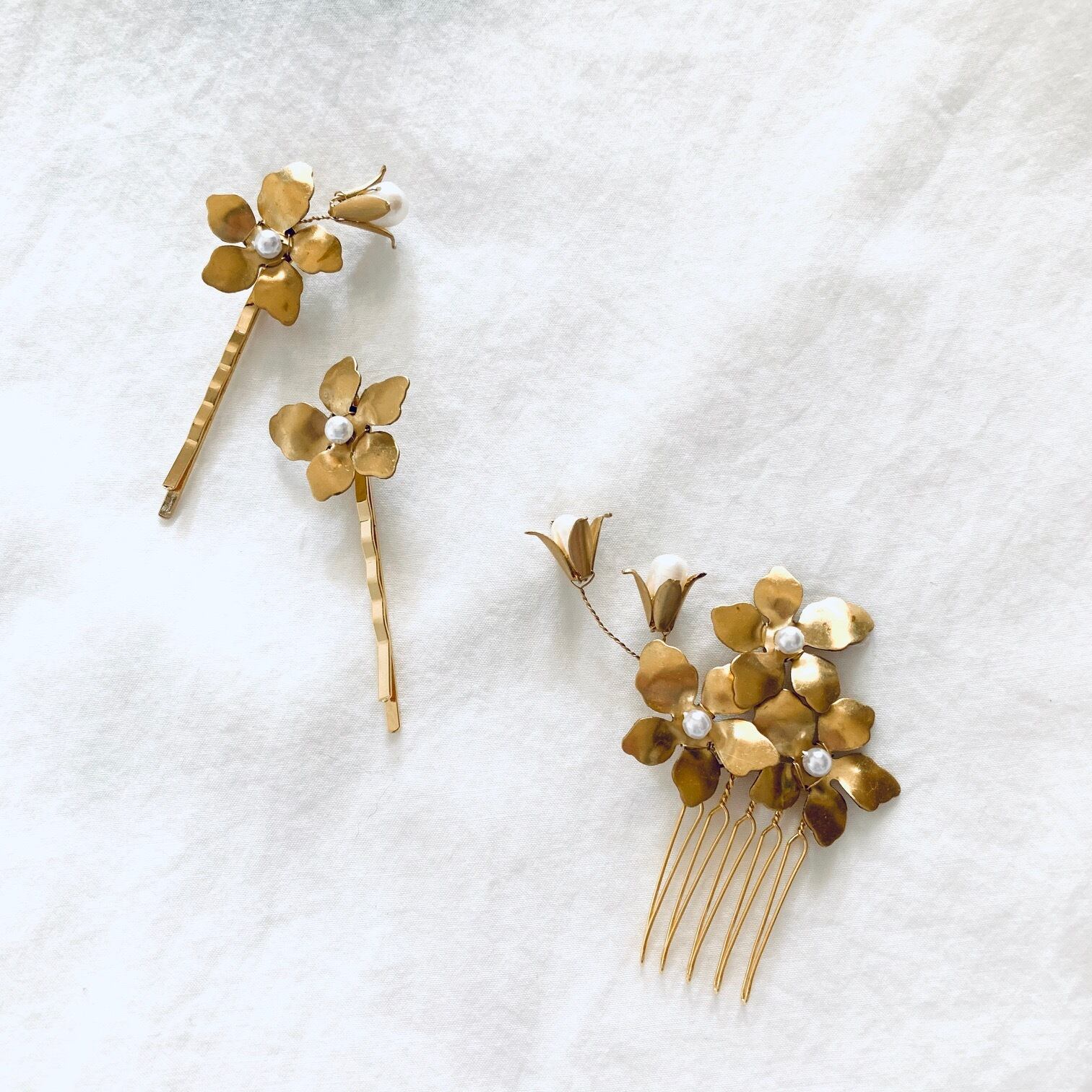2つのつぼみと束ねたようなお花のヘアコームとヘアピン2本のセットです。