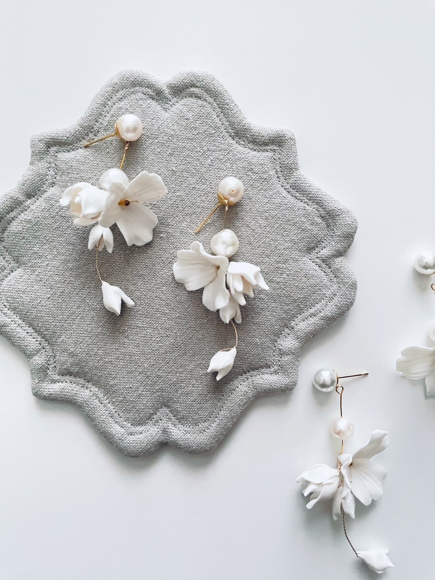 清楚な華やかさが漂いパールの輝きと控えめなつぼみが調和し、大人の女性にぴったりなホワイトカラーのアクセサリーとなっています。