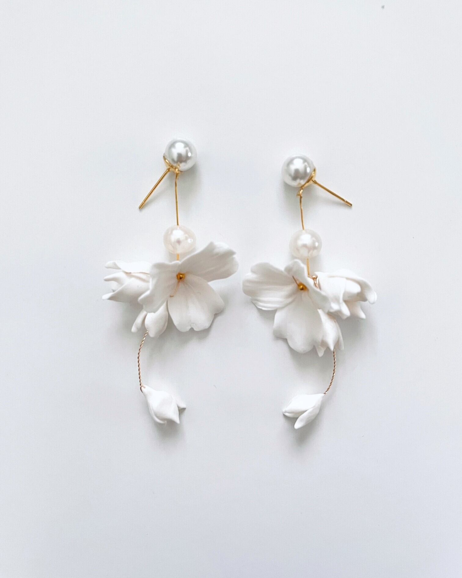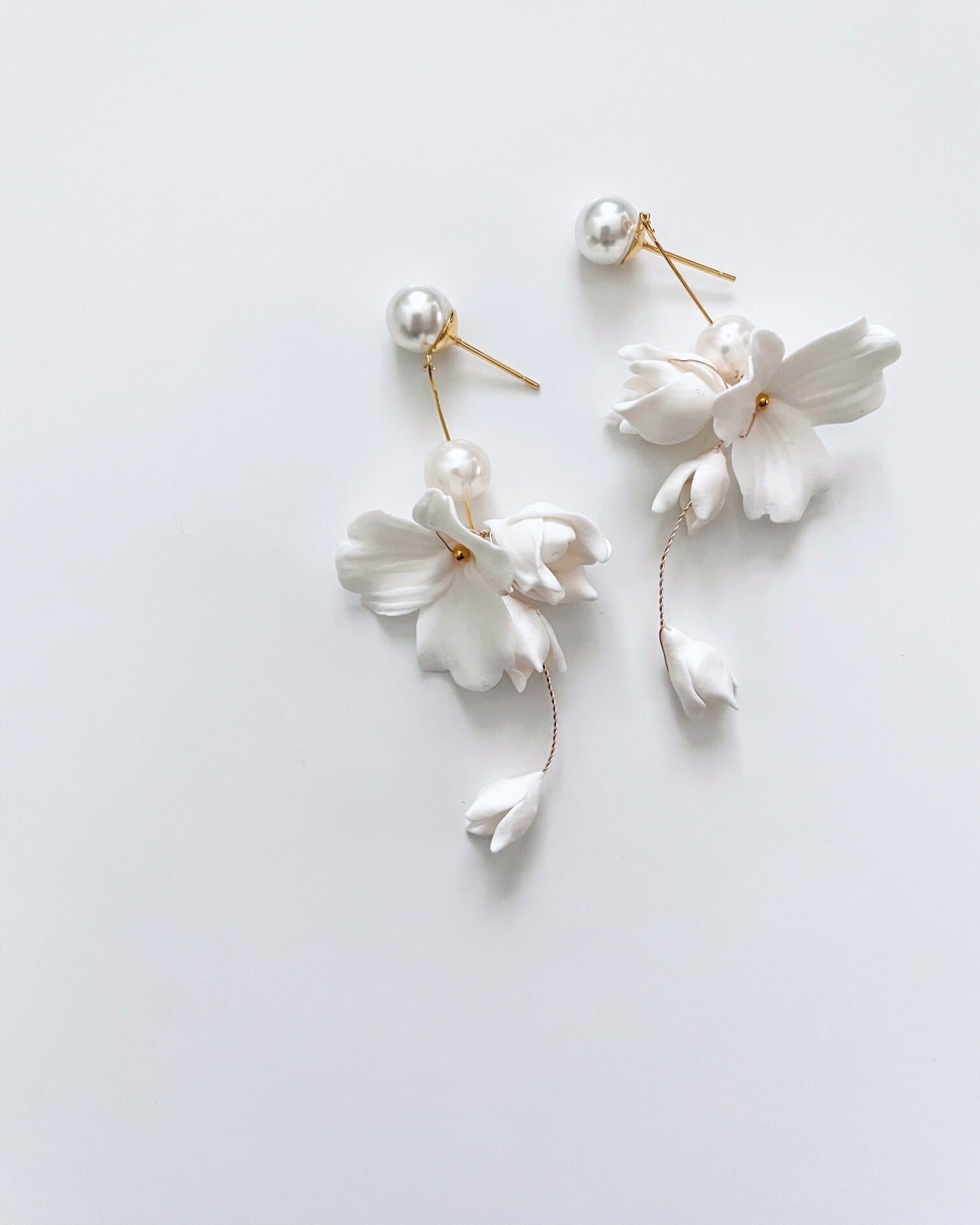 ホワイトフラワーとパールを用いた洗練されたデザインの耳飾りです。