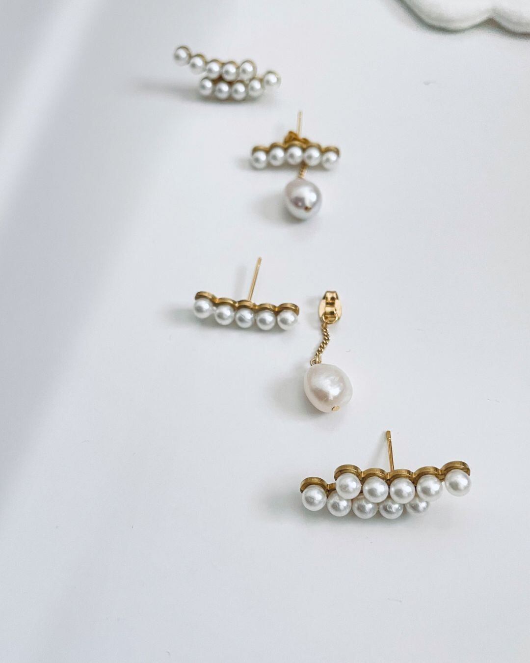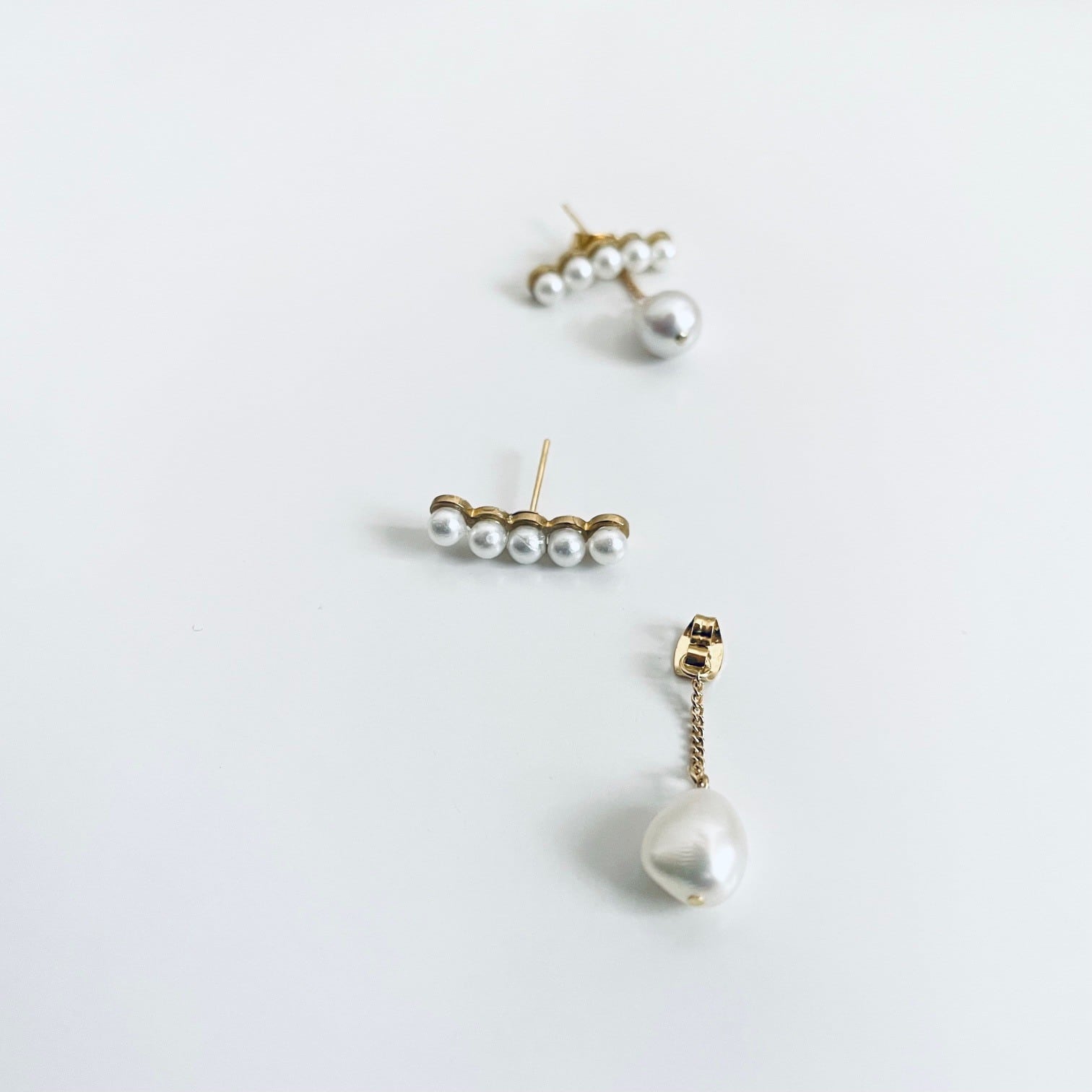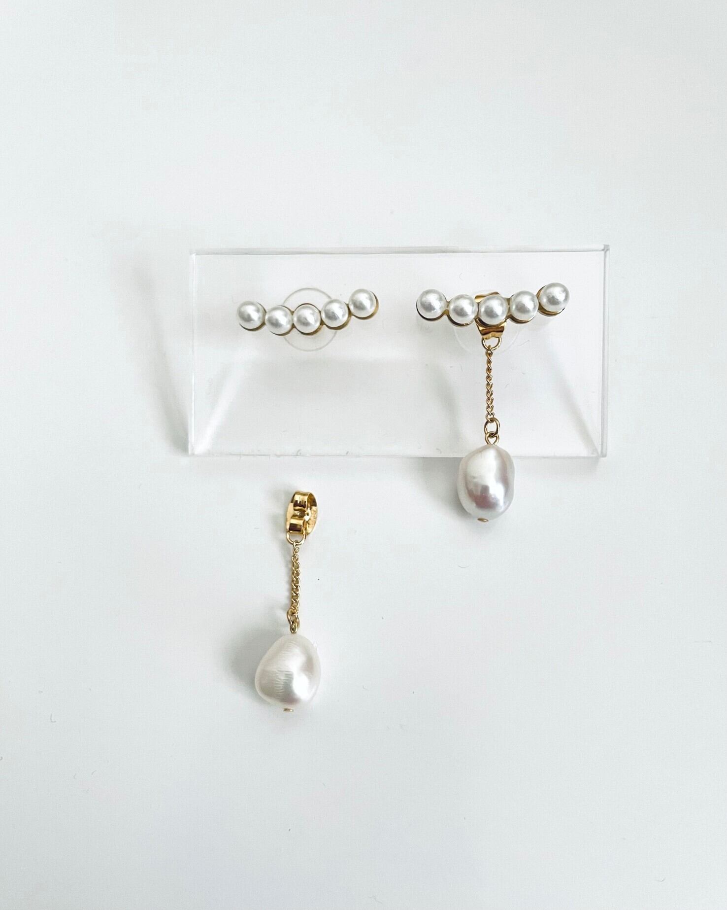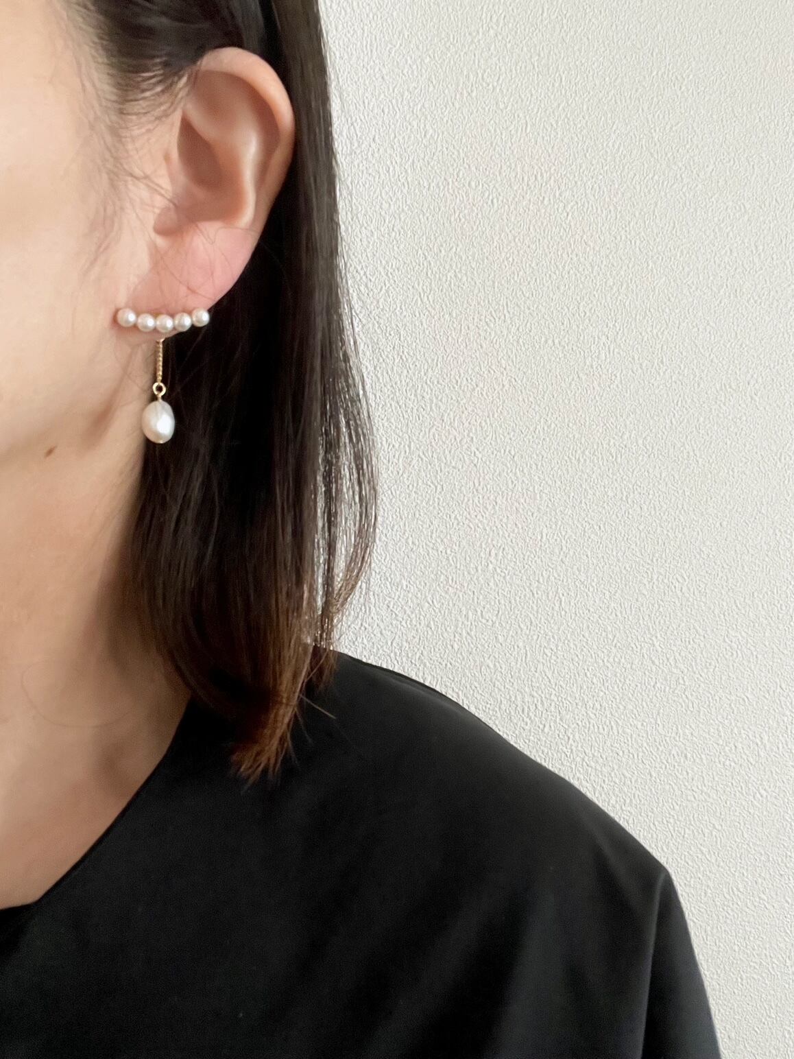 小粒のパールを横に並べたミニマルで洗練されたデザインに、やさしく揺れるドロップパールをプラスしたピアス。