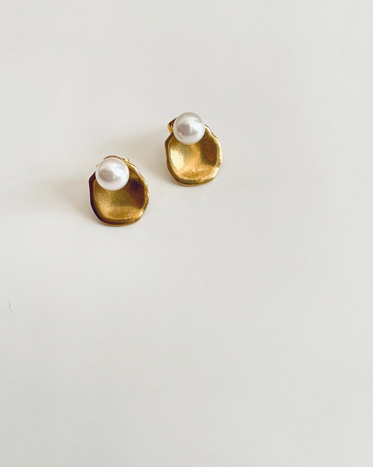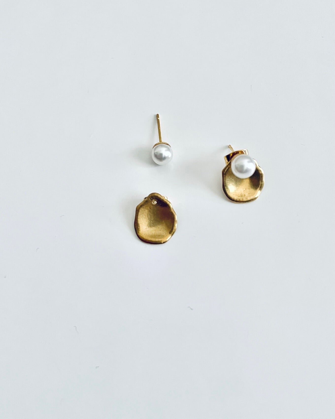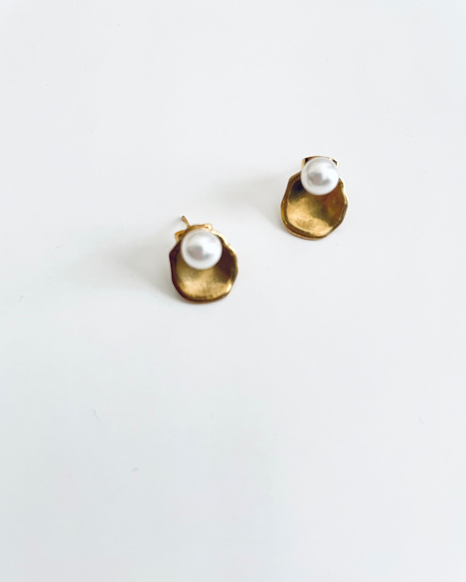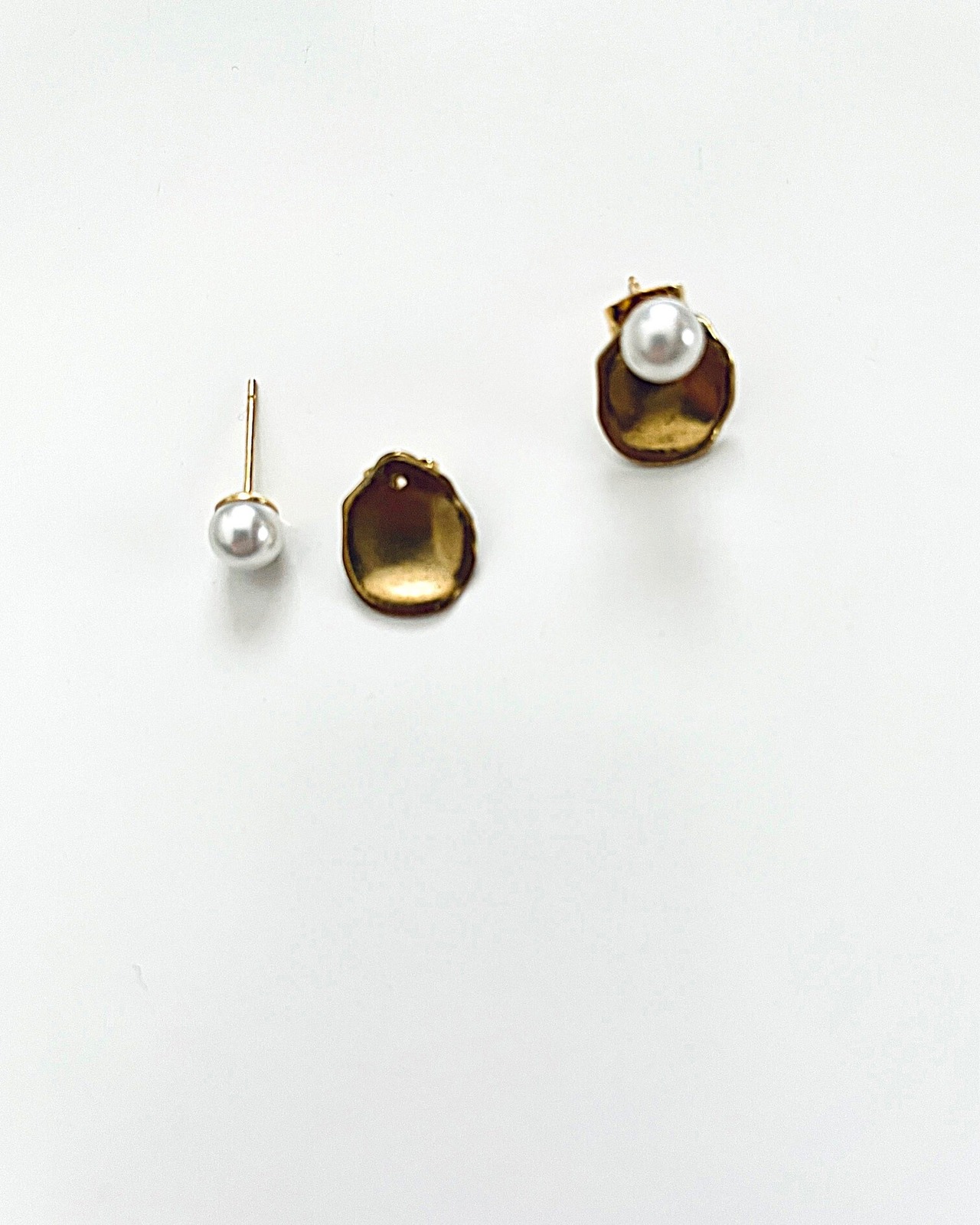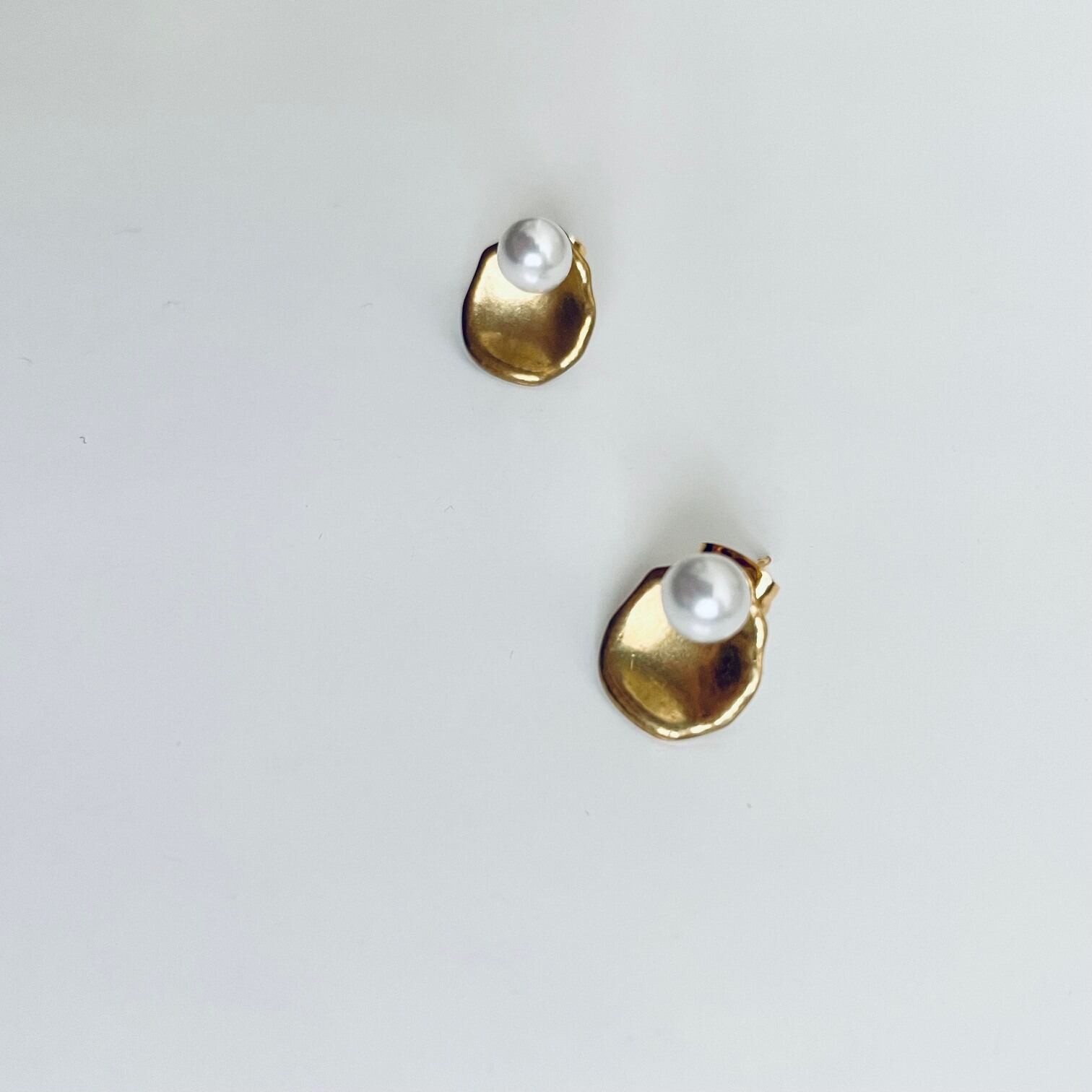 小さなパールの上品さに、マットな質感の真鍮プレートを組み合わせたミニマルなピアス。