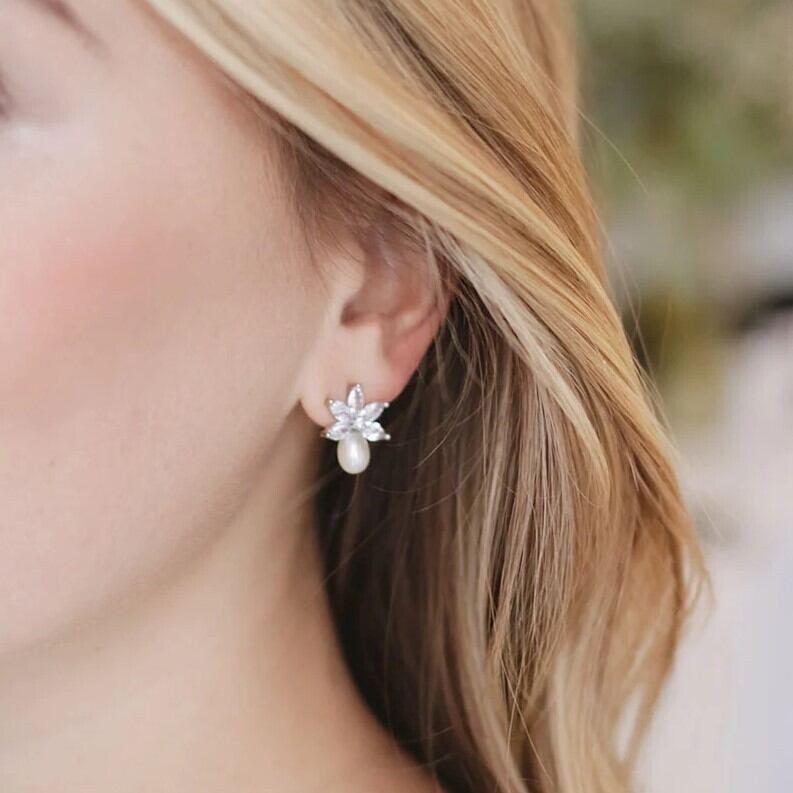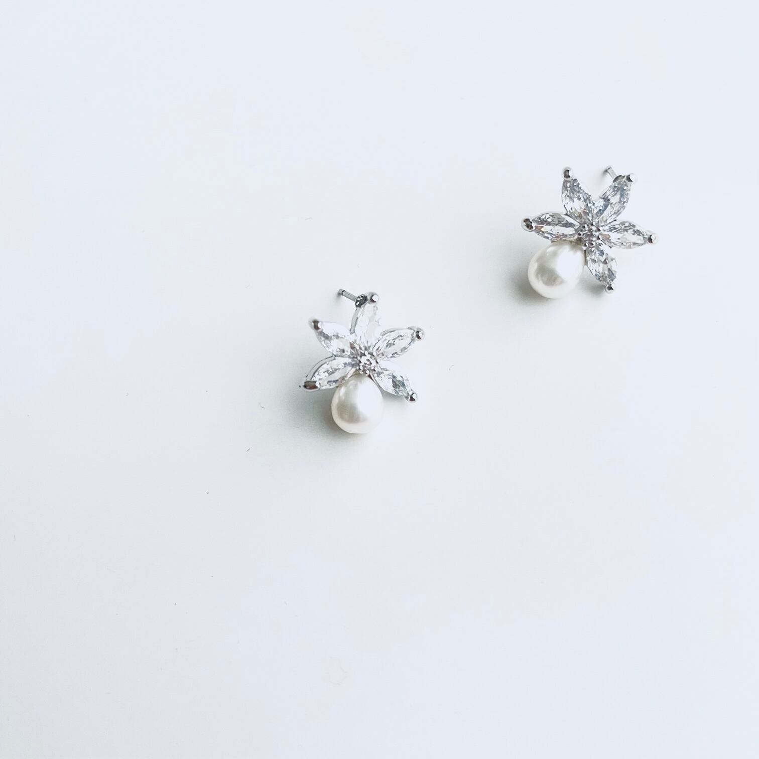 小ぶりなドロップ淡水パールとキュービックジルコニアの美しい輝きが際立つ、シンプルで上品なピアス。