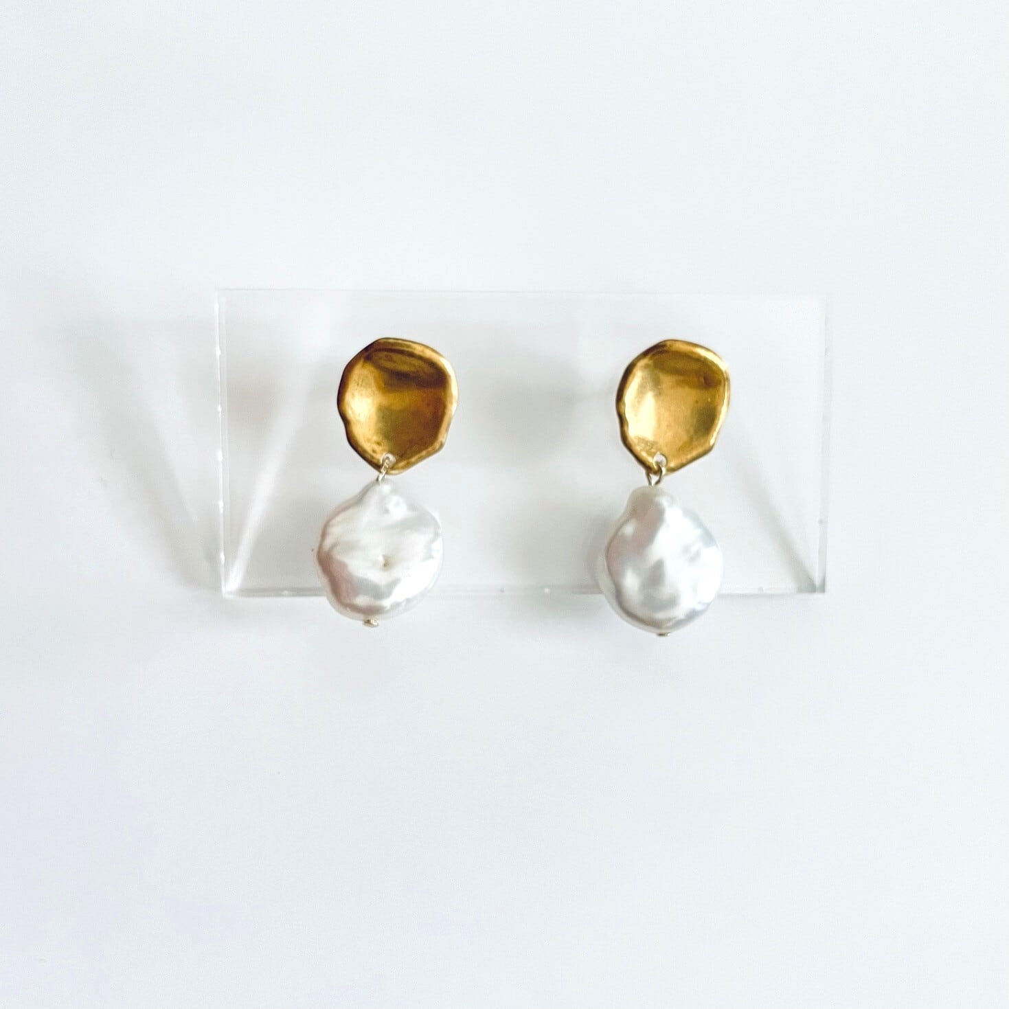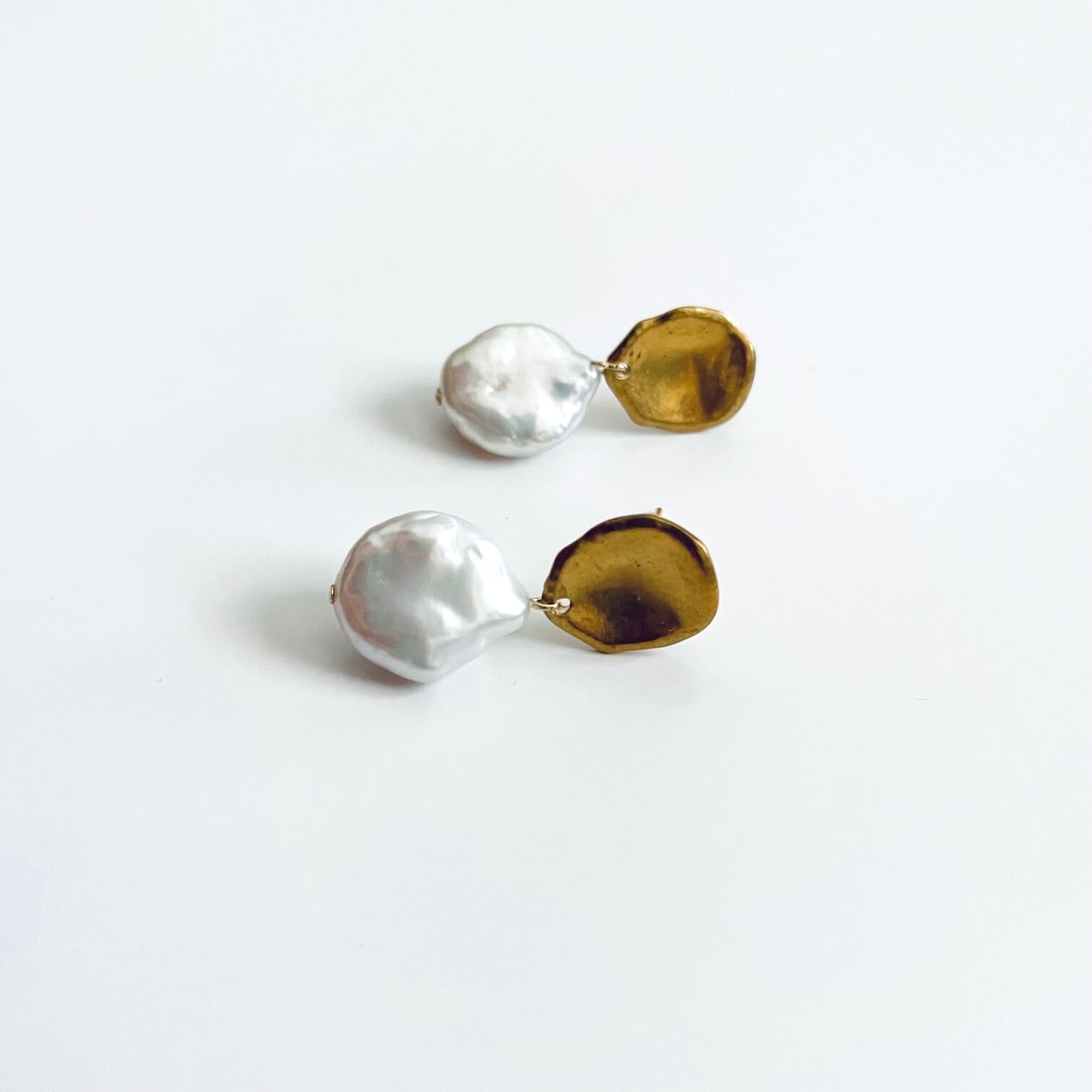 マットゴールドの真鍮パーツと艶の美しいコイン型淡水パールの耳飾りです。