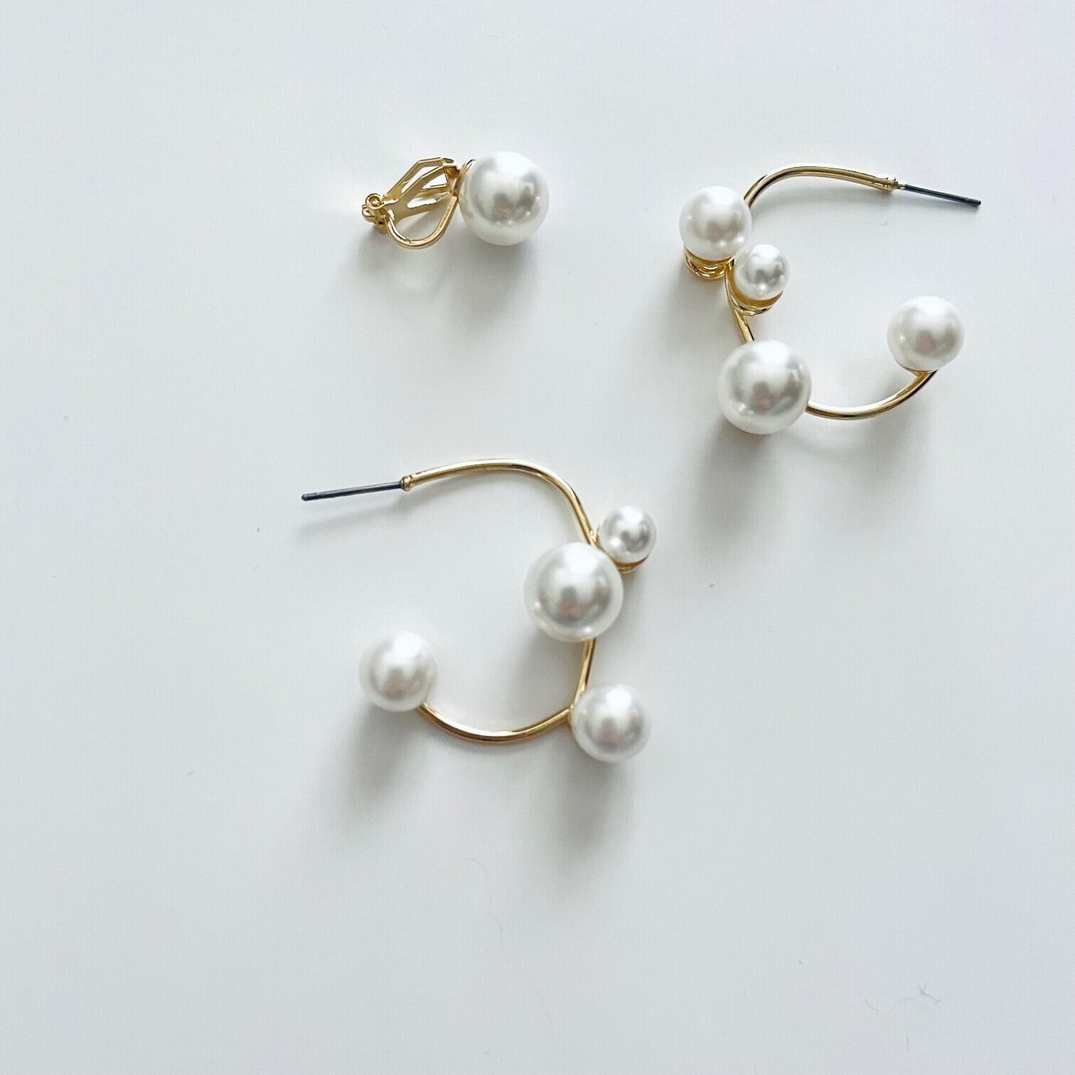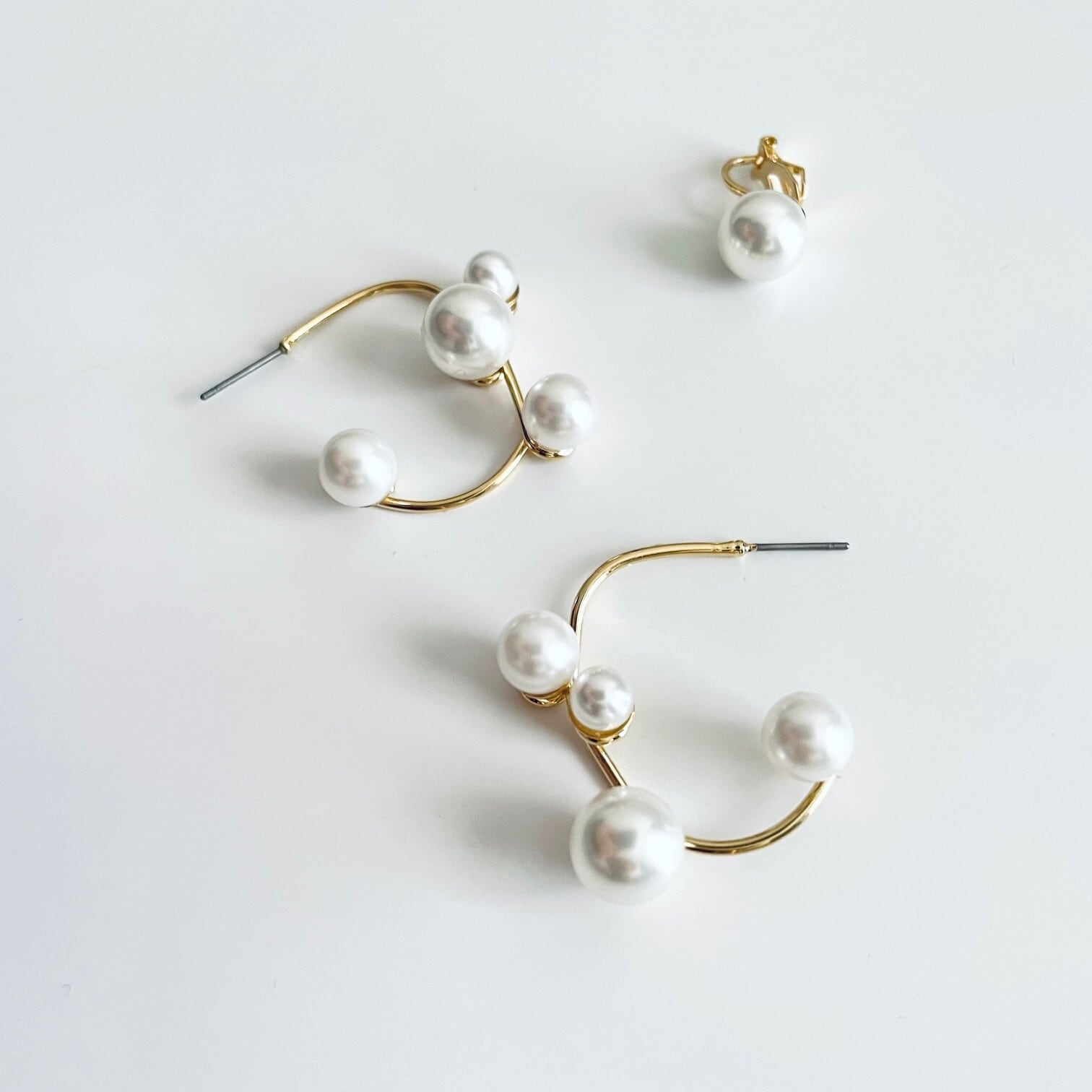 サイズの異なるパールが組み合わせたデザインは、動きがありながらも落ち着いた雰囲気を演出します。