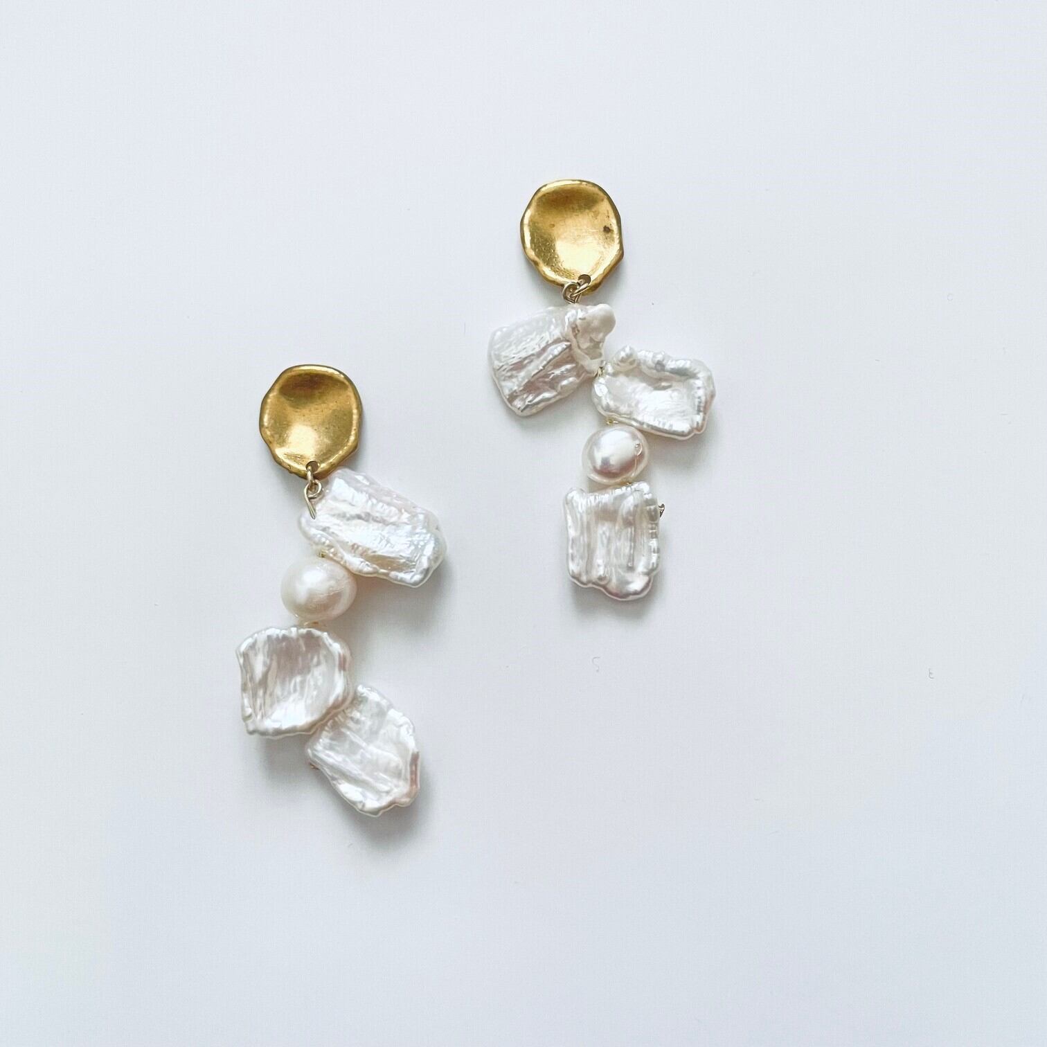 個性のある形のケシパールと淡水パールを組み合わせた左右アシンメトリーのデザインは、一際目を引く存在感を放ちます。