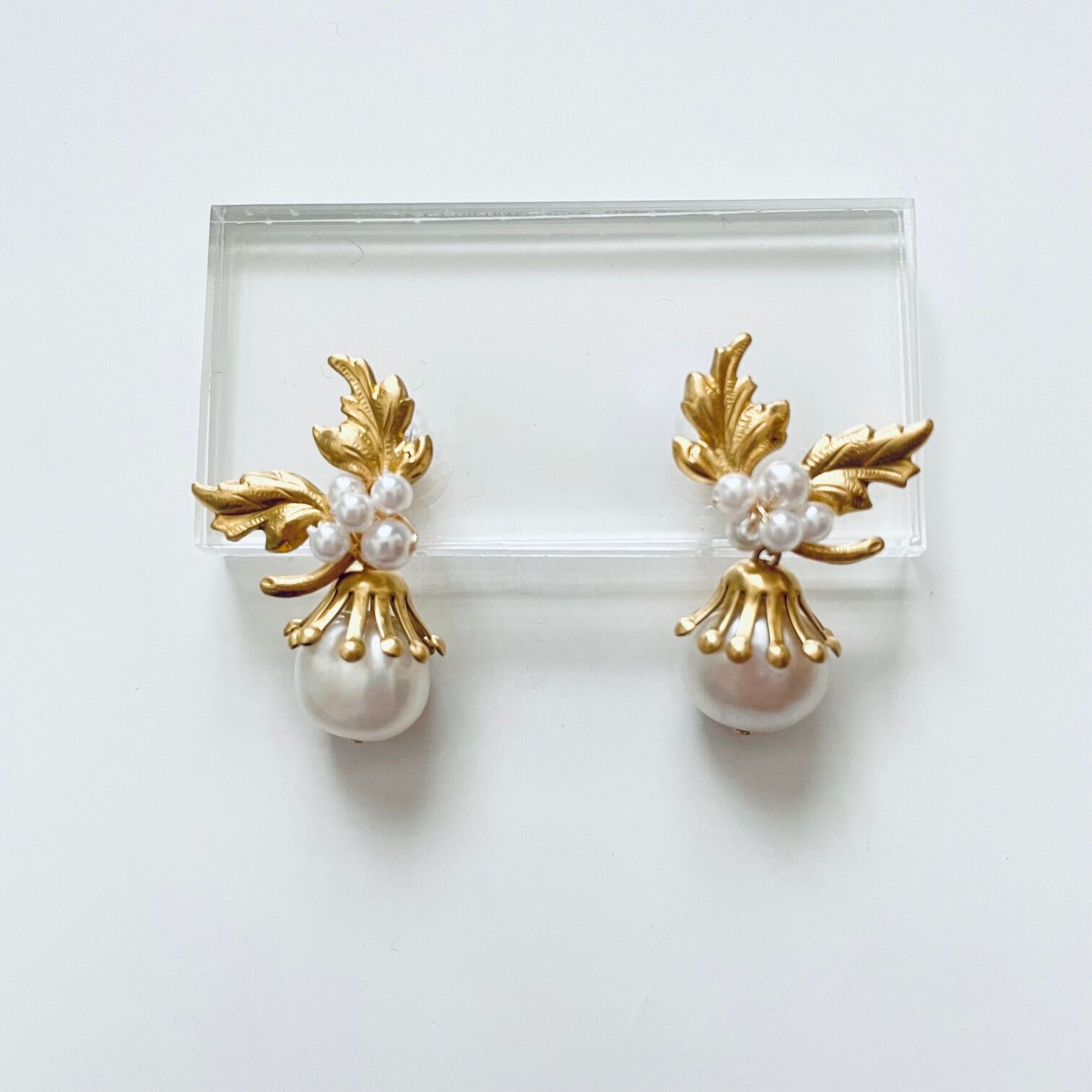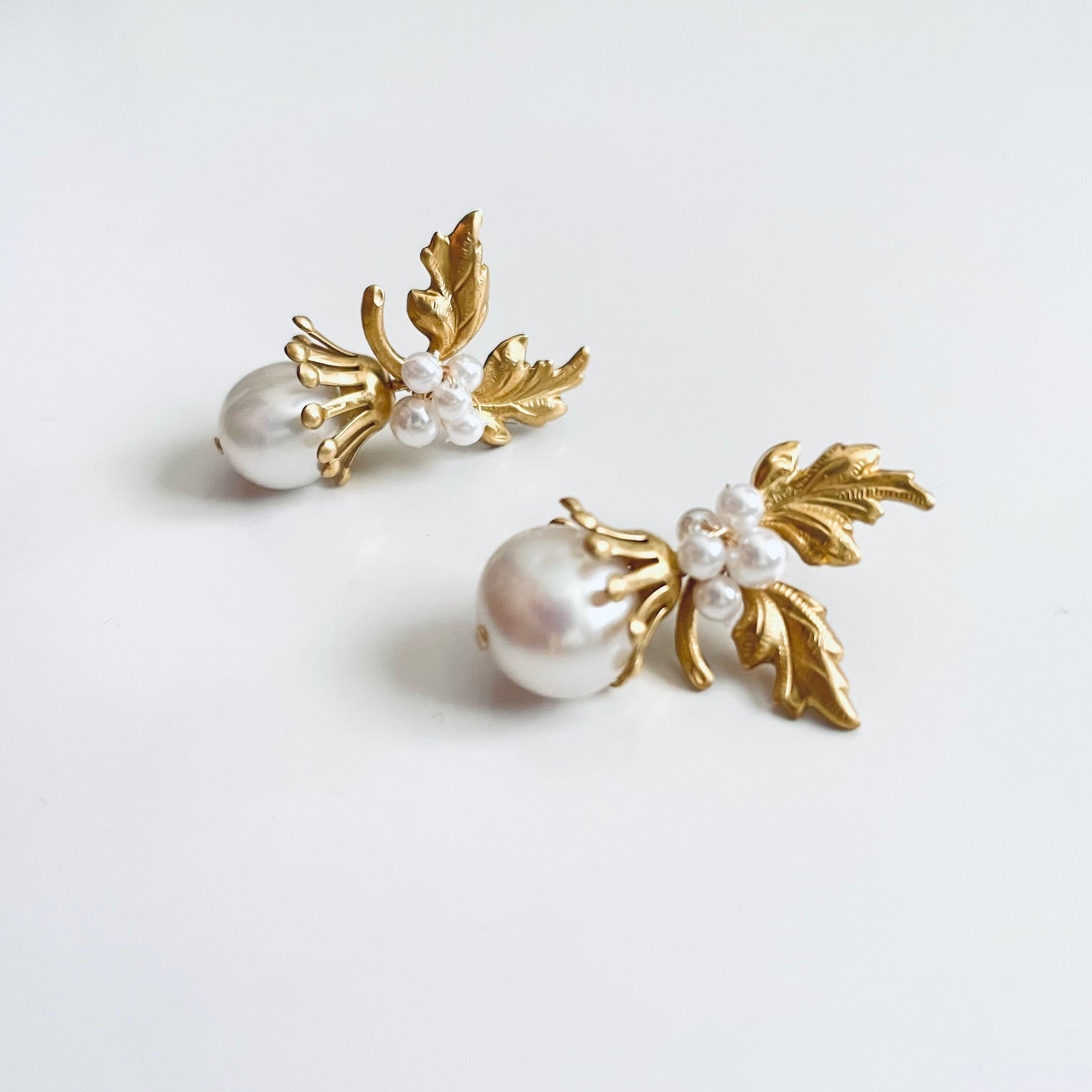 リーフ部分が耳たぶで固定され、揺れるたびに可愛らしいパールが華やかさを放ちます。