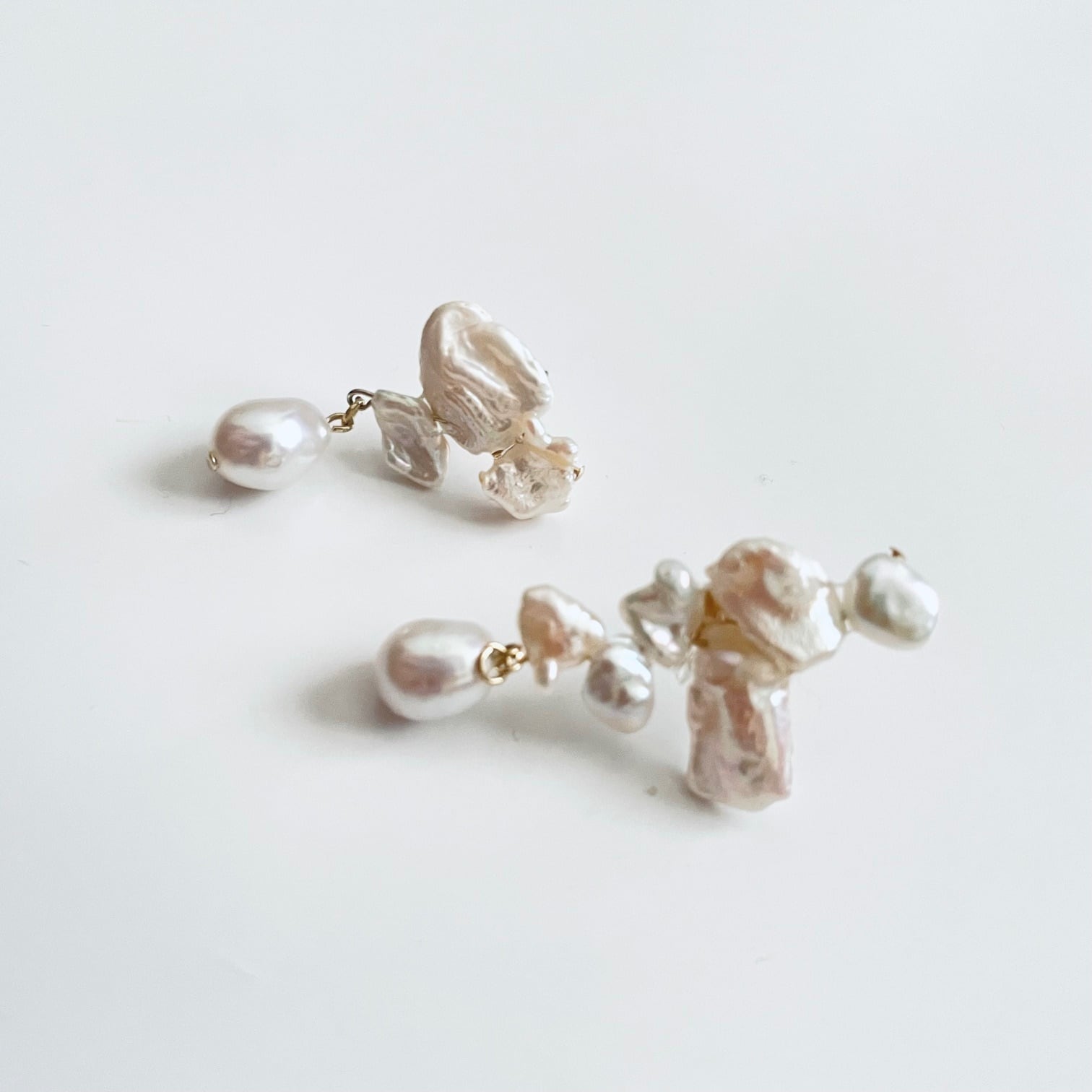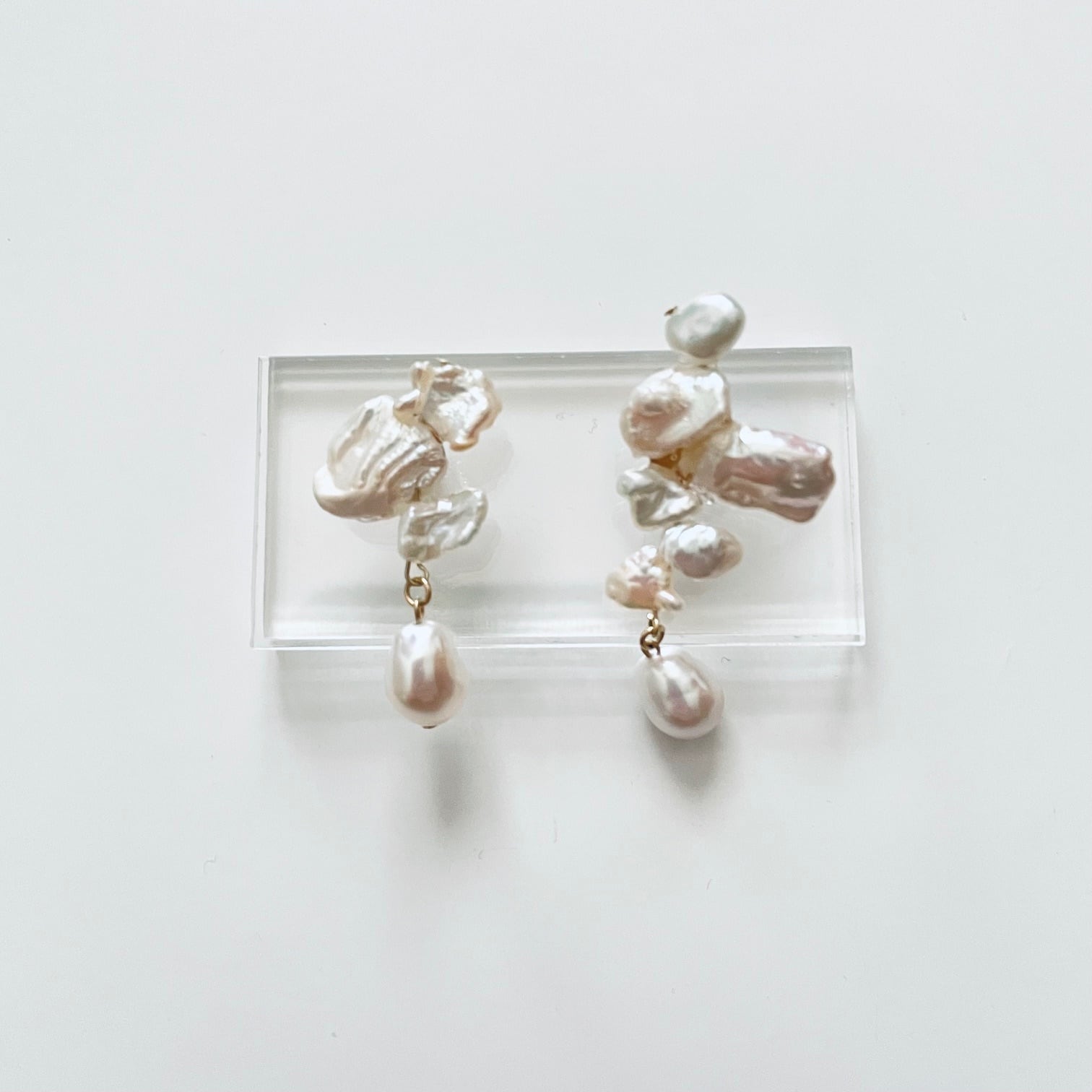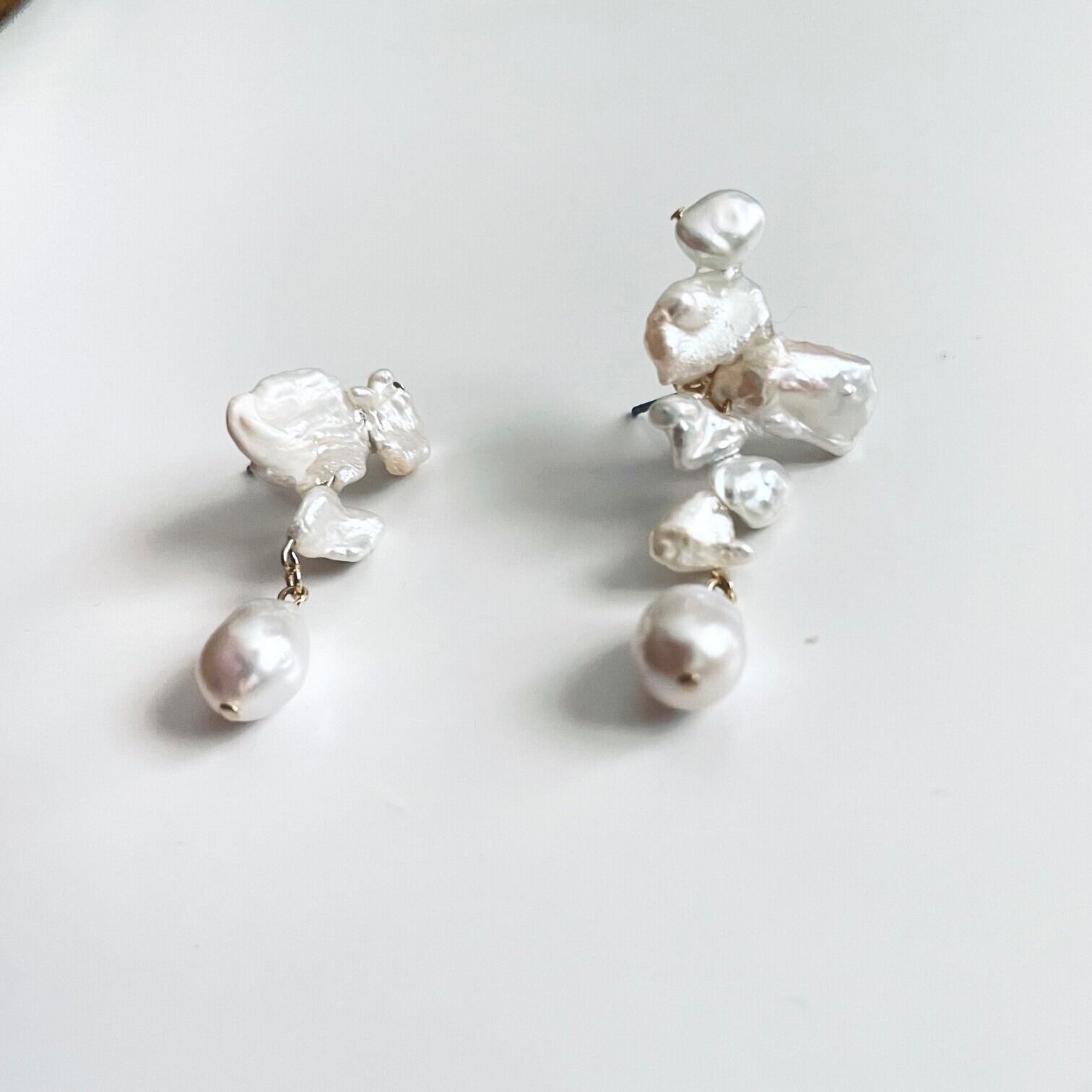 個性のある形状のパールを組み合わせたアシンメトリーデザインの耳飾り。