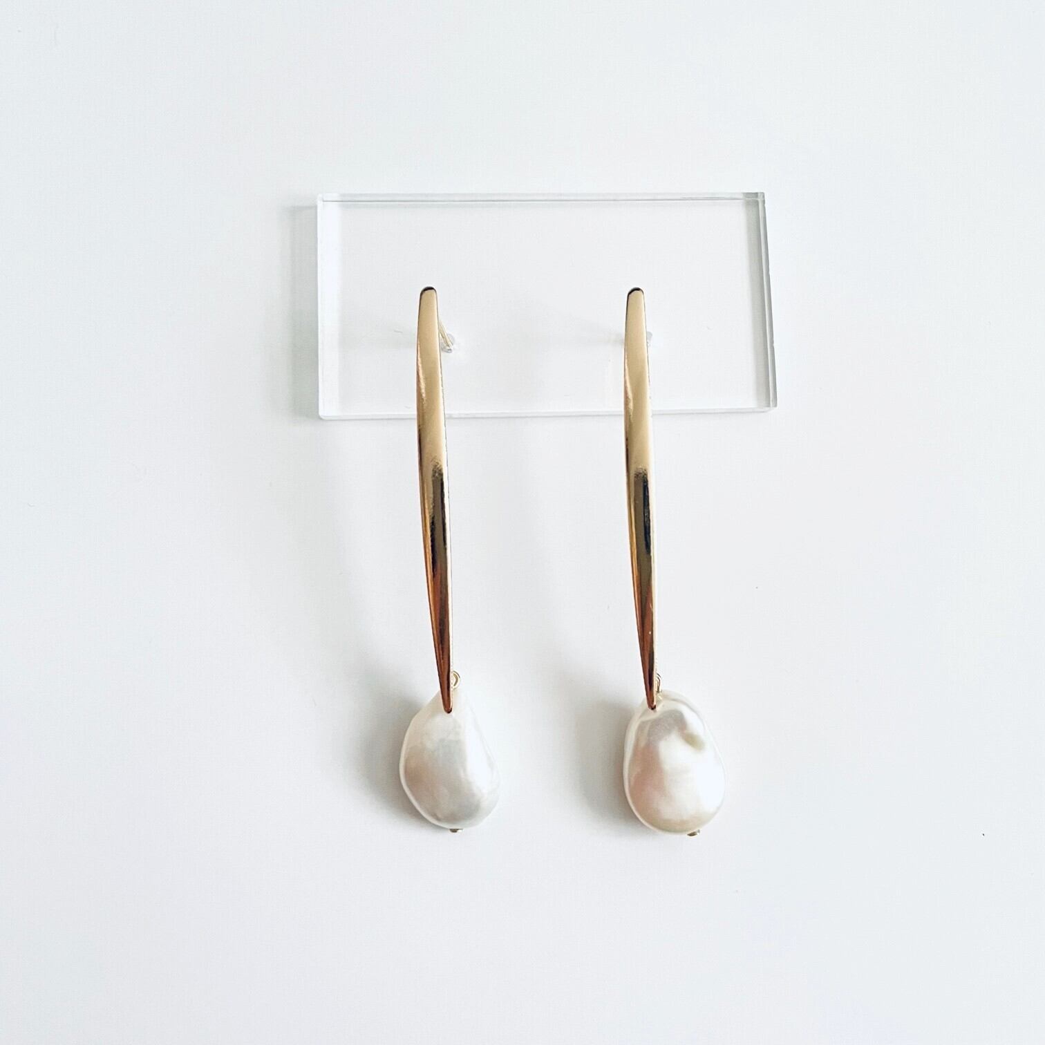 スリムで繊細なラインのロングパーに、艶の美しいドロップコイン型の淡水パールを合わせ