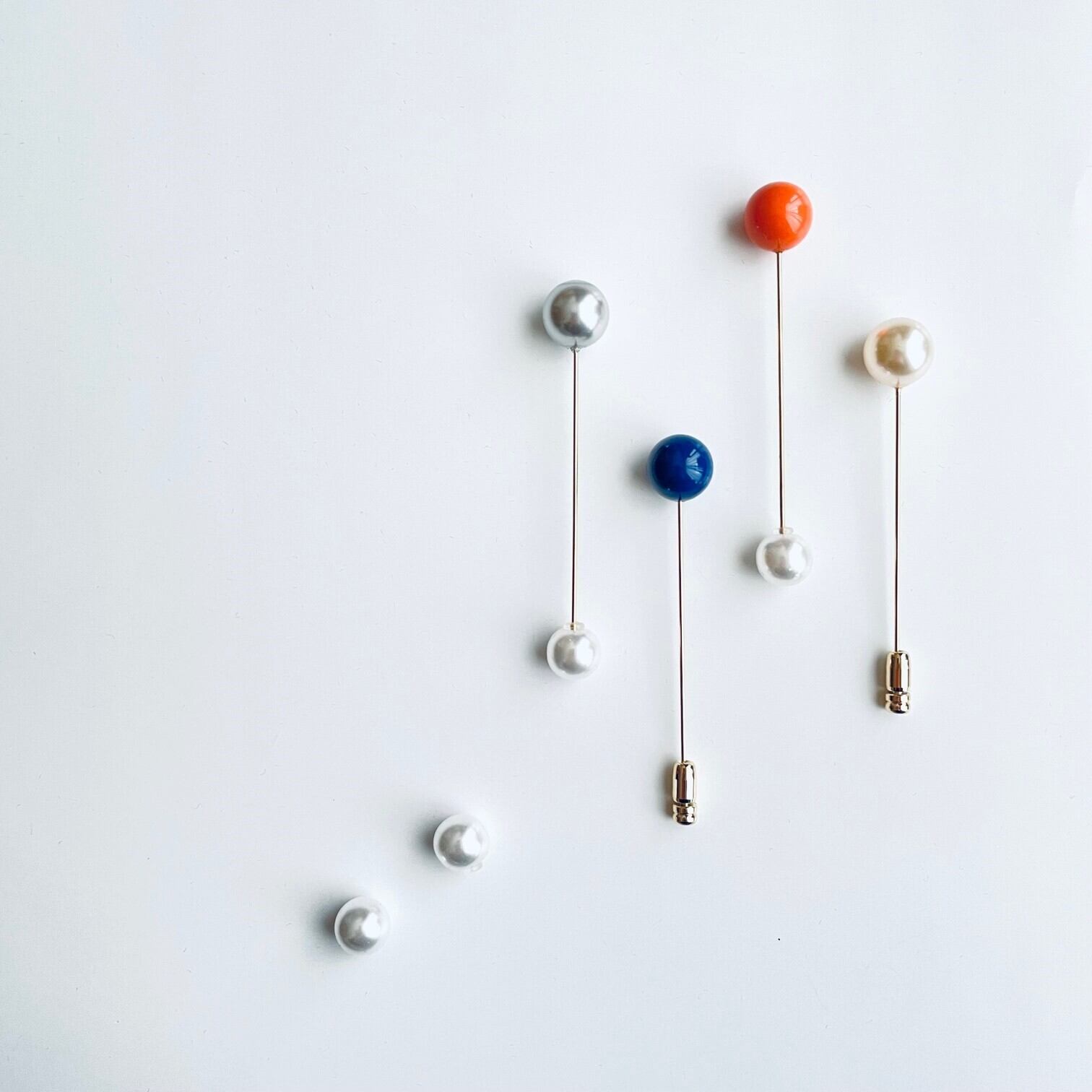 小さいサイズのパール側が取り外しができ、衣服などに刺して留めていただきます。