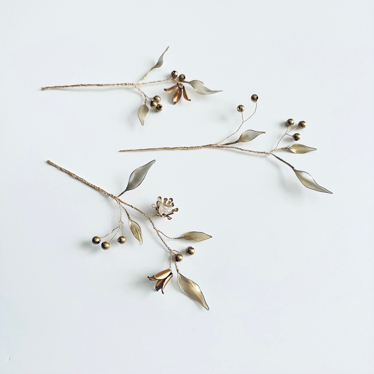 小さなリーフやビーズなどで可憐な植物をイメージして制作したヘアピン3本セット。
