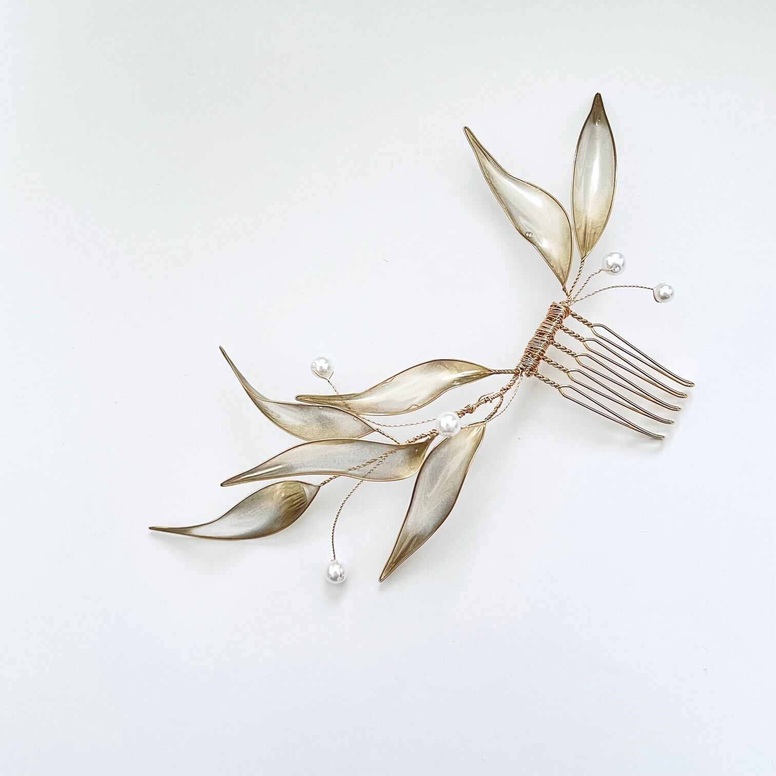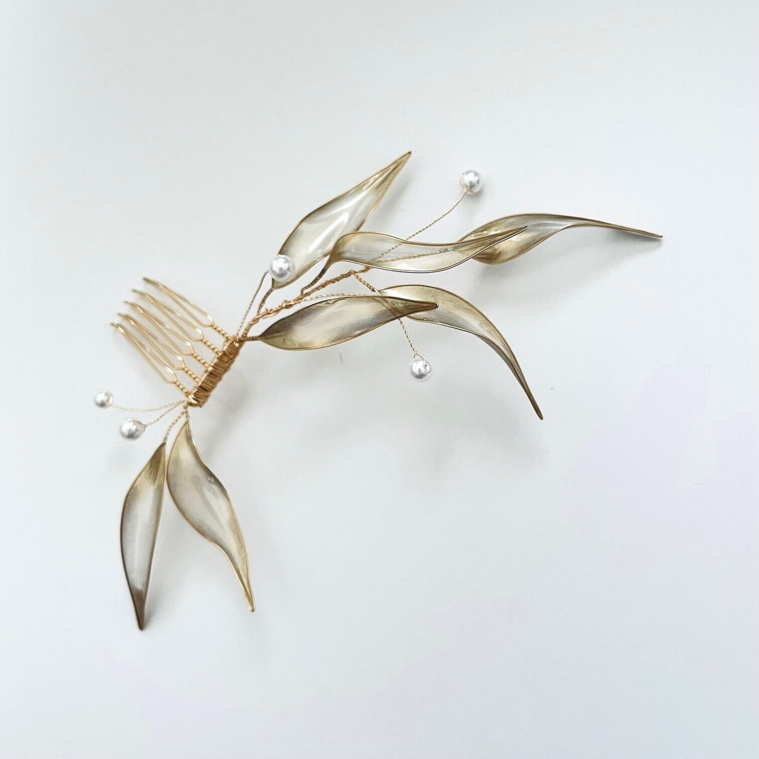 細いワイヤーでリーフパーツの形状を1から制作した繊細なヘアコームです。