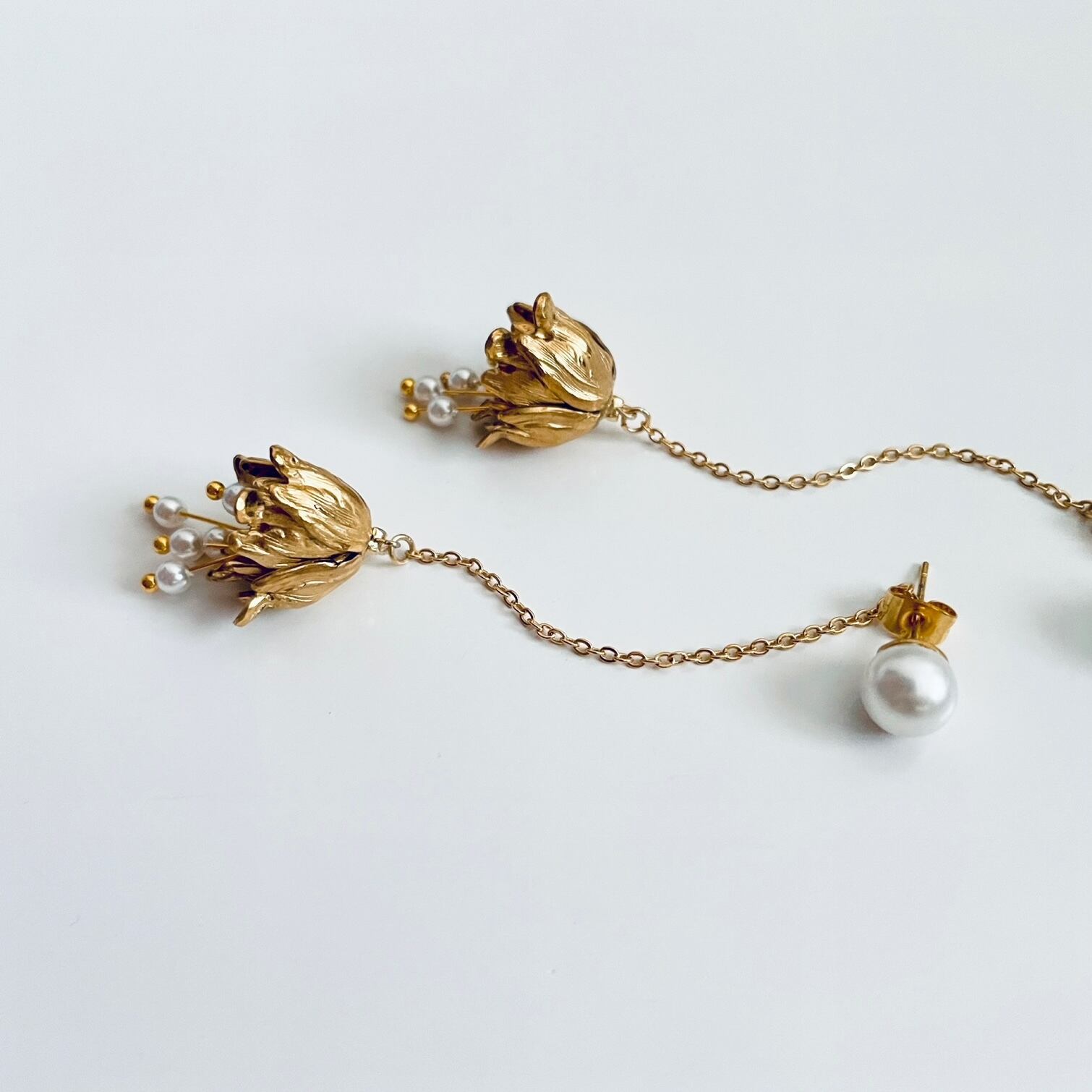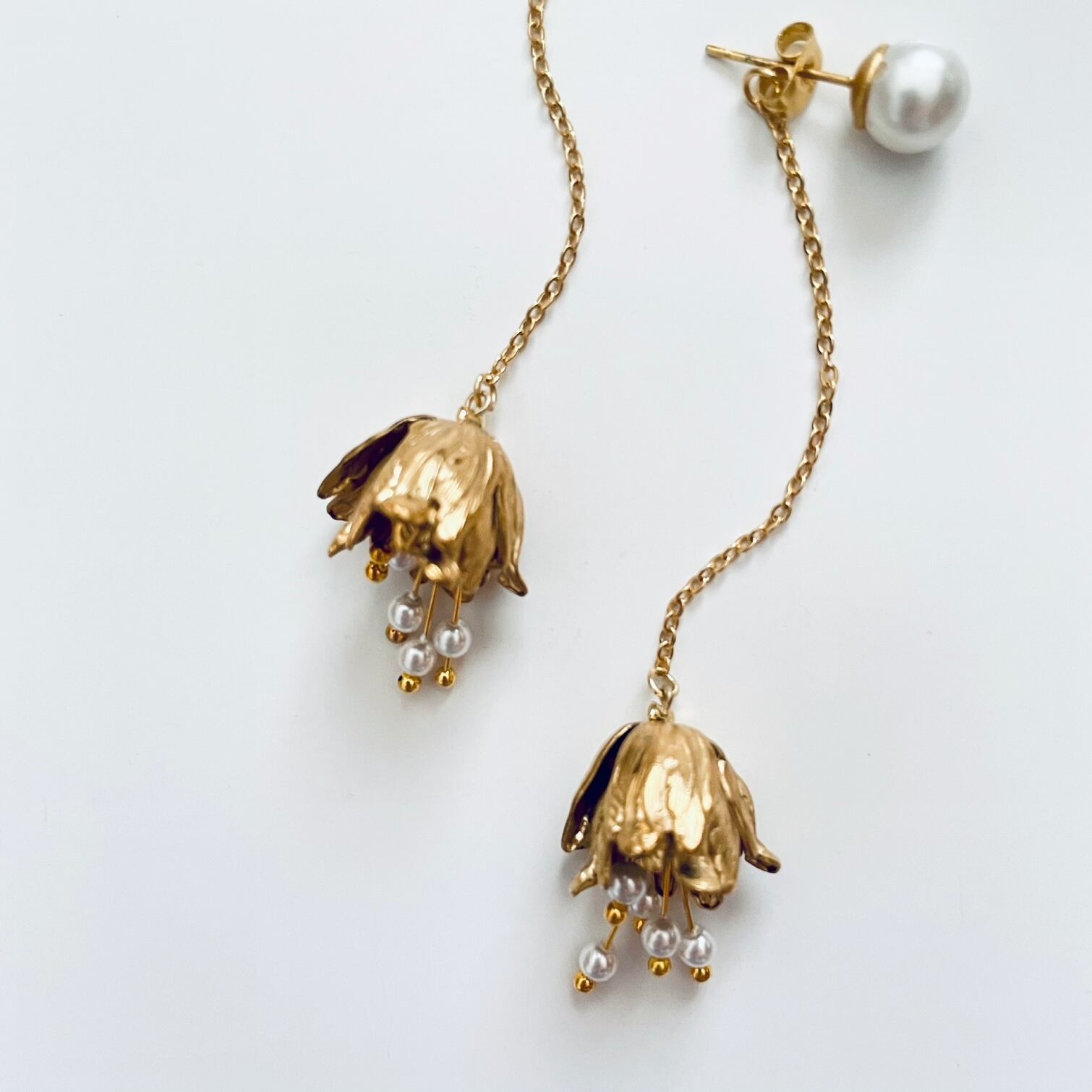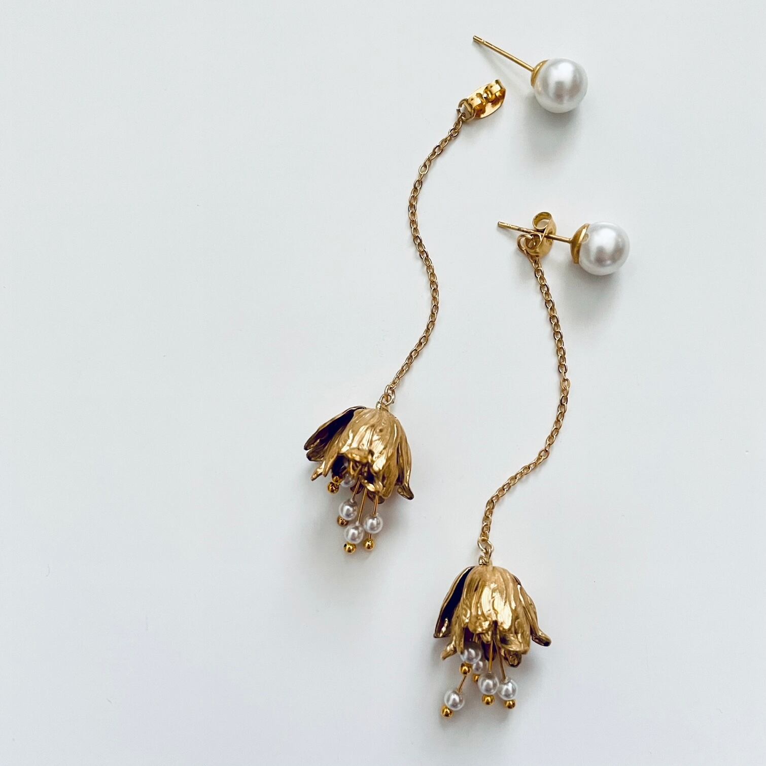 華奢なチェーンにボタニカルなつぼみがしっとり揺れるレディ感あふれる耳飾り。