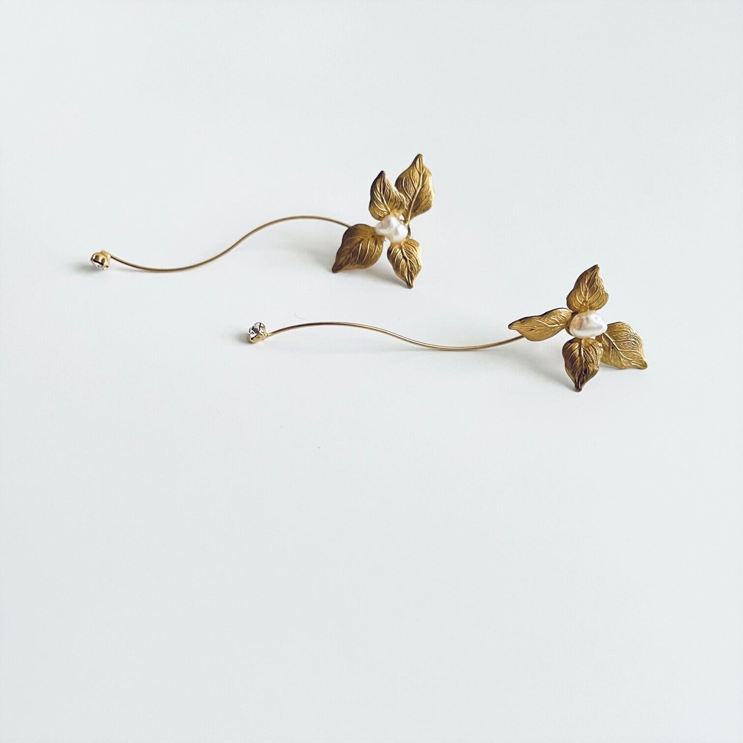 耳元には立体感をつけたリーフデザイン、その下から華奢なロングウエーブがしっとり揺れる上品さとトレンド感を併せ持つデザインです。