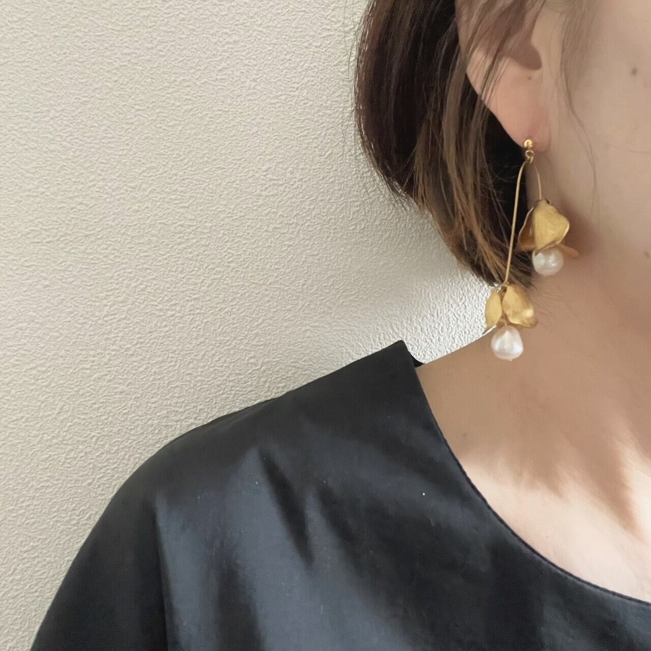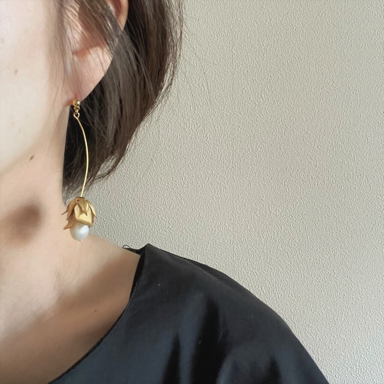 一方のピアスは緩くカーブを描くラインにお花を添えたデザインとなっています。