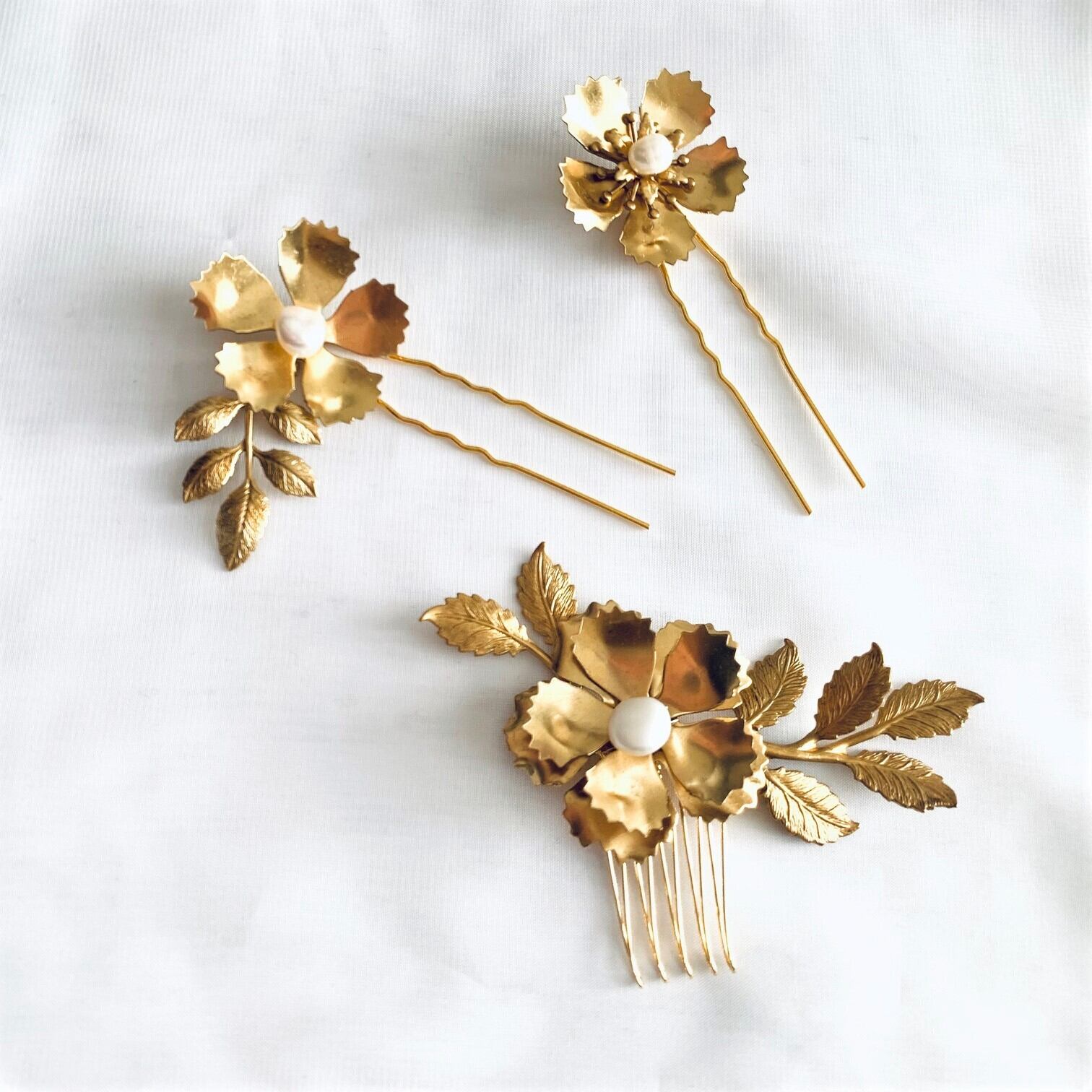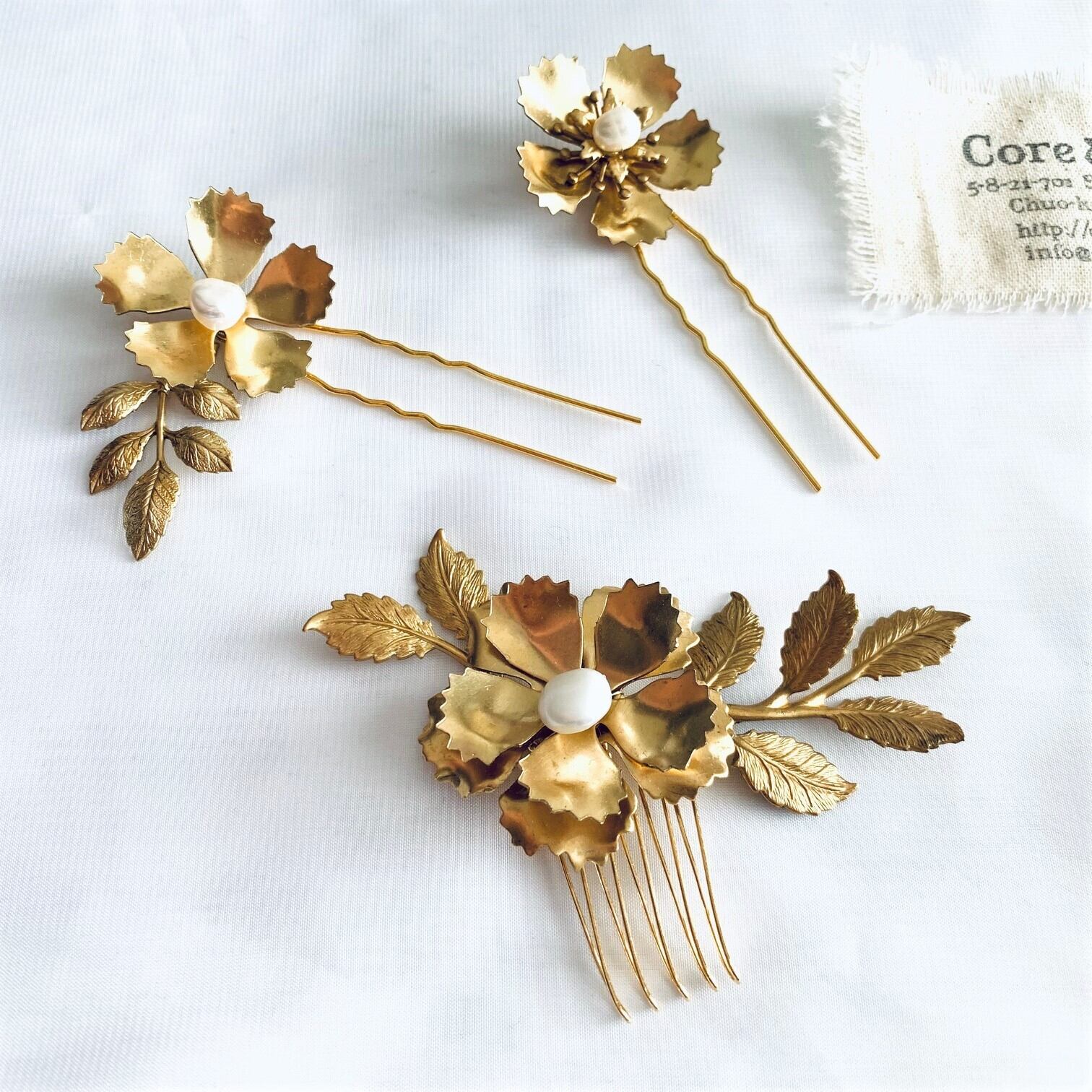 華やかな大ぶりフラワーとデザインの異なるリーフを組み合わせたヘアアクセリーのセット。
