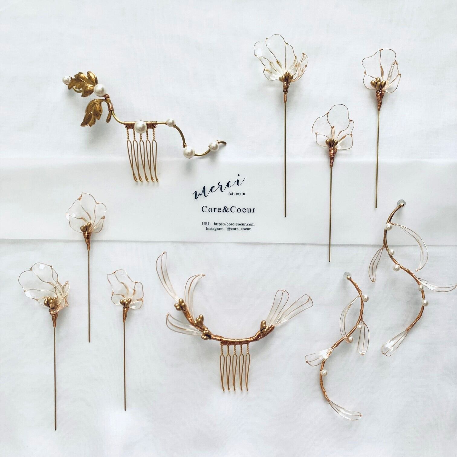 流れるような洗練されたクリアのリーフに、アクセントにゴールドのつぶつぶをつけて可愛らしさもプラス。